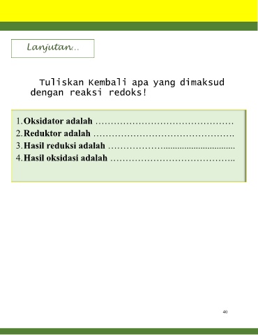 Lanjutan… Tuliskan Kembali apa yang dimaksud dengan reaksi redoks! 1. Oksidator adalah ……………………………………… 2. Reduktor adalah ………………………………………. 3. Hasil reduksi adalah ………………............................... 4. Hasil oksidasi adalah ………………………………….. 40