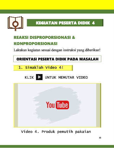 KEGIATAN PESERTA DIDIK 4 REAKSI DISPROPORSIONASI & KONPROPORSIONASI Lakukan kegiatan sesuai dengan instruksi yang diberikan! ORIENTASI PESERTA DIDIK PADA MASALAH 1. Simaklah Video 4! KLIK UNTUK MEMUTAR VIDEO Video 4. Produk pemutih pakaian 48