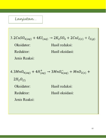 Lanjutan… 3. 2 4( ) + 4 ( ) → 2 + 2 2( ) + 2( ) 2 4 Oksidator: Hasil reduksi: Reduktor: Hasil oksidasi: Jenis Reaksi: + − 4. 3 + 4 → 3 + + 4( ) ( ) 4( ) 2( ) 2 2 ( ) Oksidator: Hasil reduksi: Reduktor: Hasil oksidasi: Jenis Reaksi: 55