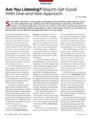 MARKETING              Are You Listening? Resorts Get Social              With Give-and-Take Approach                                                                                                            BY MIKE BISNER                     ocial media... talk about a moving target and changing environment! With so many available options                     for communicating these days, “getting social” has moved well beyond just asking to be “liked” on              SFacebook. Every day we read about a new start-up company or “must-have” app that helps spread the              word to friends and strangers alike by sharing photos or video via the Internet. If there’s any confusion about              how ski resorts can best utilize this new media and staff for it, it’s no wonder.              Further complicating things is the fact   Resort, which launched a very success-  it has now expanded to include content              that different demographics have adopted   ful “LET’S GET SOCIAL” campaign.   generated by the resort guest. Deer Valley              different social format preferences and   Camelback identified six social channels   has recognized that the most important              continue to push out their various uses   and opened them as a two-way commu-  element to a successful social media cam-              as an open communications tool (e.g.,   nications tool to engage fans and visitors.   paign is to have content that represents              Facebook for the parent posting photos,   With a commitment not only to listen but  the resort’s brand image while simultane-              and Vine video for the GoPro teen sharing   also to carry out positive changes based   ously aligning with its customers’ interests.              his or her on-mountain experience with   on fan feedback, the resort managed to   Think of deploying social media as an              peers). That’s why today’s resorts need to   integrate social media into its entire mar-  extension of your overall brand market-              set up “listening tools” to monitor what   keting platform, encouraging and high-  ing. Deer Valley (winner of the 2013-14              is being talked about with respect to their   lighting resort user posts, photos, video,   Best Social Media Campaign) did exactly              resort and brand—and they need to be   and feedback.                     that, and networked its social media to              prepared to respond to consumers using   Camelback established six different   reinforce the resort’s overall brand mes-              Twitter and other channels as a real-time   Hashtag Hangouts to cover the preferred   sage and values. Deer Valley recognizes              communication exchange.              engagement of various demographic users   that enabling resort visitors to participate                 Any of the listening tool providers can   of social media while upping the engage-  by sharing their experience is a new form              help you gauge responses and what is being   ment and interaction with each visi-  of testimonial advertising, without the              discussed online on these various social   tor. The numbers from Google reporting   agency production costs.              media channels, and they can help you   speak loudly. Camelback’s growth and   My personal favorite social media ini-              figure out what works and what doesn’t   rankings on each of these social channels   tiative came from Alyeska Resort, Alaska,              in short order. (Check out Meltwater,   far outpaced any other program, especially  with its fun departure from using tradi-              Hootsuite, Radian6, and Sysomos for their   for a regional resort of its size. What made   tional skiing or powder shots in its mate-              approach to gathering online activities   Camelback unique was its commitment to  rials. As any mega-advertising agency will              related to your area of interest.)   make social media a two-way engagement   tell you, you can’t go wrong using dogs                 The relevance and effectiveness of   supported by contests, on-snow promo-  and kids in your advertising. Everyone              these and other social media tools are   tions and reinforcement, and promoting   loves these engaging photos. Alyeska’s              often seen in the entries NSAA receives for   recognition and listening to its visitors.  use of its adorable rescue dogs as the cor-              the Best Social Media Campaign category   This next example reminds us that   nerstone for attracting and aggregating              of the NSAA Marketing Awards. There   Facebook, Twitter, Instagram, Vine,   fans and followers across the social media              are such excellent examples of how NSAA   Vimeo, Flickr, and other up-and-coming   channels was brilliant.              member resorts are using these tools that it   channels all rely on content. We’ve heard it   The resort started off by sharing pho-              would be a waste not to share them. Here   a million times, but content truly is king   tos of the dogs early in the normally slow              is a brief look at three of the best entries in   in that it drives engagement and sharing.   off-season on its website and Facebook              the 2013-14 competition.             That’s where Utah’s Deer Valley Resort   page. By posting puppy pictures of the                 One example of a well thought-    really shines.                      new trainee avalanche rescue dogs (almost              out social media entry came from        Where this resort’s marketing depart-  not fair), Alyeska ultimately reached              Pennsylvania’s Camelback Mountain    ment once exclusively generated content,   32,000 people who saw the post and              64  |  NSAA Journal  |  EARLY WINTER 2014                                                      w w w. n s a a 