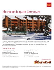 No resort is quite like yours No financial services company delivers solutions quite like ours. We recognize that your business faces a unique set of risks every day. Our team can help you assess and minimize those risks so you can focus on running your business. Let us show you why many of the largest resorts in North America have looked to us for solutions to protect their business now and for the long term. Team up with us today. Gardiner de Back, Sacramento, CA Brian Derouin, Seattle, WA 916-558-4027 | debackpg@wellsfargo.com 206-701-5219 | brian.derouin@safehold.com Scott Myers, Sacramento, CA Ryan Patrick, Portsmouth, NH 916-558-4033 | scott.a.myers@wellsfargo.com 603-559-1380 | ryan.patrick@safehold.com Rob Andrews, Seattle, WA Helen Richards, Lakewood, CO 970-328-6633 | robert.e.andrews@safehold.com 720-963-6540 | helen.richards@safehold.com Products and services are offered through Safehold Special Risk, Inc., dba Safehold Special Risk & Insurance Services Inc. in California, a non-bank insurance agency affiliate of Wells Fargo & Company. Coverage is provided by unaffiliated insurance companies with the exception of crop and flood insurance which may be underwritten by Safehold Special Risk, Inc.’s affiliate, Rural Community Insurance Company. © 2014 Wells Fargo Bank, N.A. All rights reserved. WCS-1173163 NSAA Summer 2014 prepressed v6a.indd 71 7/3/14 4:23 PM