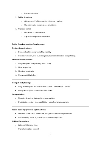 • Choice of diluent, binder, disintegrant, lubricant based on compatibility.