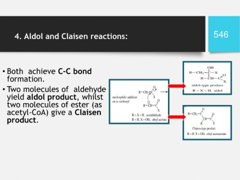 4. Aldol and Claisen reactions: 546 • Both achieve C-C bond formation. • Two molecules of aldehyde yield aldol product, whilst two molecules of ester (as acetyl-CoA) give a Claisen product.