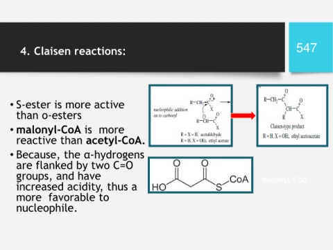 4. Claisen reactions: 547 • S-ester is more active Malonyl-CoA than o-esters • malonyl-CoA is more reactive than acetyl-CoA. • Because, the α-hydrogens are flanked by two C=O groups, and have increased acidity, thus a more favorable to nucleophile.