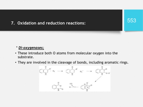 7. Oxidation and reduction reactions: 553 * Di-oxygenases; • These introduce both O atoms from molecular oxygen into the substrate. • They are involved in the cleavage of bonds, including aromatic rings.
