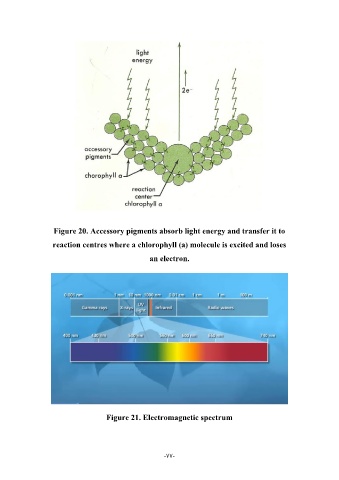 Figure 20. Accessory pigments absorb light energy and transfer it to reaction centres where a chlorophyll (a) molecule is excited and loses an electron. Figure 21. Electromagnetic spectrum -٧٧-