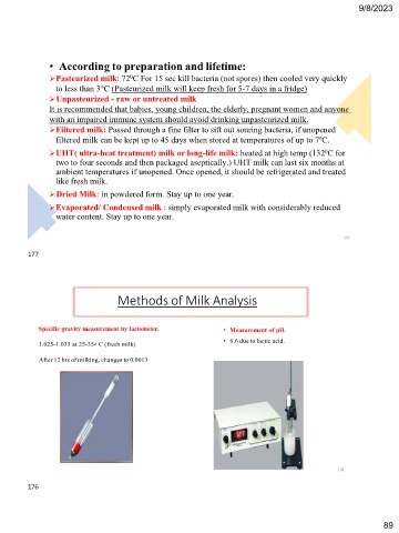 Specific gravity measurement by lactometer. • Measurement of pH.