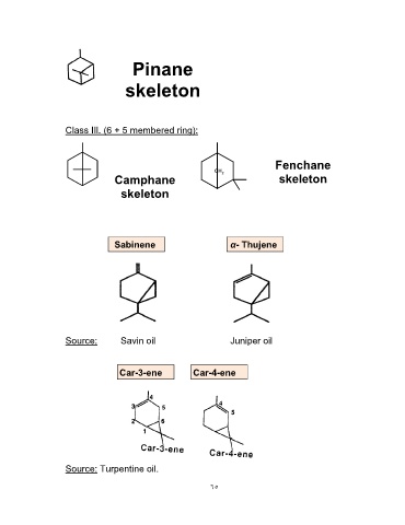 Pinane skeleton Class IIl. (6 + 5 membered ring): Camphane CH2 Fenchane skeleton skeleton Sabinene α- Thujene Source: Savin oil Juniper oil Car-3-ene Car-4-ene Source: Turpentine oil. ٦٥