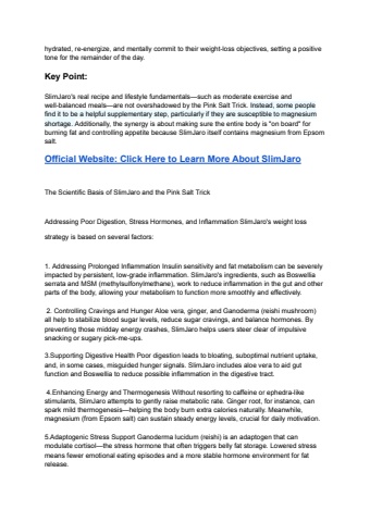hydrated,re-energize,andmentallycommittotheirweight-lossobjectives,settingapositivetonefortheremainderoftheday.KeyPoint:SlimJaro'srealrecipeandlifestylefundamentals%u2014suchasmoderateexerciseandwell-balancedmeals%u2014arenotovershadowedbythePinkSaltTrick.Instead,somepeoplefindittobeahelpfulsupplementarystep,particularlyiftheyaresusceptibletomagnesiumshortage.Additionally,thesynergyisaboutmakingsuretheentirebodyis\burningfatandcontrollingappetitebecauseSlimJaroitselfcontainsmagnesiumfromEpsomsalt.OfficialWebsite:ClickHeretoLearnMoreAboutSlimJaroTheScientificBasisofSlimJaroandthePinkSaltTrickAddressingPoorDigestion,StressHormones,andInflammationSlimJaro'sweightlossstrategyisbasedonseveralfactors:1.AddressingProlongedInflammationInsulinsensitivityandfatmetabolismcanbeseverelyimpactedbypersistent,low-gradeinflammation.SlimJaro'singredients,suchasBoswelliaserrataandMSM(methylsulfonylmethane),worktoreduceinflammationinthegutandotherpartsofthebody,allowingyourmetabolismtofunctionmoresmoothlyandeffectively.2.ControllingCravingsandHungerAloevera,ginger,andGanoderma(reishimushroom)allhelptostabiizebloodsugarlevels,reducesugarcravings,andbalancehormones.Bypreventingthosemiddayenergycrashes,SlimJarohelpsuserssteerclearofimpulsivesnackingorsugarypick-me-ups.3.SupportingDigestiveHealthPoordigestionleadstobloating,suboptimalnutrientuptake,and,insomecases,misguidedhungersignals.SlimJaroincludesaloeveratoaidgutfunctionandBoswelliatoreducepossibleinfammationinthedigestivetract.4.EnhancingEnergyandThermogenesisWithoutresortingtocaffeineorephedra-lkestimulants,SlimJaroattemptstogentlyraisemetabolicrate.Gingerroot,forinstance,cansparkmildthermogeness%u2014helpingthebodyburnextracaloriesnaturally.Meanwhile,magnesium(fromEpsomsalt)cansustainsteadyenergylevels,crucialfordailymotivation.5.AdaptogenicStressSupportGanodermalucidum(reishi)isanadaptogenthatcanmodulatecortisolthestresshormonethatoftentriggersbellyfatstorage.Loweredstressmeansfeweremotionaleatingepisodesandamorestablehormoneenvironmentforfatrelease.