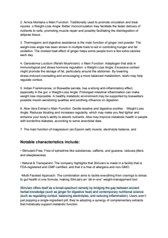 2.ArnicaMontanaoMainFunction:Traditionallyusedtopromotecirculationandtreatinjuries.oWeight-LossAngle:Bettermicrocirculationmayfacilitatethefasterdeliveryofnutrientstocells,promotingmusclerepairandpossiblyfacilitatingthedisintegrationofadiposetissue.3.Thermogenicanddigestiveassistanceisthemainfunctonofgingerrootpowder.Theweight-lossanglehasbeenshowninmultipletrialstoaidincontrollinghungerandfatoxidation.Themodestheateffectofgingerhelpssomepeopleburnafewextracalorieseachday.4.GanodermaLucidum(ReishiMushroom):oMainFunction:Adaptogenthataidsinimmunologicalandstresshormoneregulation.oWeight-LossAngle:Excessivecortisolmightpromotethestorageoffat,particularlyaroundtheabdomen.Byloweringstress-inducedovereatingandencouragingamorebalancedmetabolism,reishimayhelpregulatecortisol.5.IndianFrankincense,orBoswelliaserrata,hasastronganti-inflammatoryeffect,especiallyinthegut.oWeight-LossAnge:Prolongedintestinalinflammationcanmakeweightlossimpossible.Ahealthymetabolicenvironmentmaybesupportedbyboswellia'spossibleinsulin-sensitizingqualitiesandsoothinginfluenceondigestion.6.AloeVeraExtractoMainFunction:Gentlelaxativeanddigestivesoother.%u00b7Weght-LossAngle:Reducesbloatingandincreasesregularity,whichmaymakeyoufeellighterandenhanceyourbody'sabilitytoabsorbnutrients.Aloemayimprovemetabolichealthinpeoplewithborderlinediabetes,accordingtosomeanecdotadata.7.Themainfunctionofmagnesium(asEpsomsalt)muscle,electrolytebalance,andNotablecharacteristicsinclude:%u2022Stmulant-Free:Freeofephedrine-likesubstances,caffeine,andguarana.reducesjittersandsleeplessness.%u2022Natural&Transparent:ThecompanyhighlightsthatSlimJaroismadeinafacilitythatisFDA-registeredandGMP-certified,andthatitisfreeofallergensandnon-GMO.%u2022Multi-FacetedApproach:Thecombinatonaimstotackleeverythingfromcravingstostresstoguthealthinoneformula,makingSlimJaroan%u201call-in-one%u201dweight-managementtool.SlimJarooffersitselfasabroad-spectrumremedybybridgingthegapbetweenancentherbalknowledge(suchasgingerfordigestiveheat)andcontemporarynutritionalscience(suchasregulatingcortiso,balancingelectrolytes,andreducingnflammation).Usersaren%u2019tjustpoppingasingle-ingredientpill;they%u2019readoptingasynergyofcomplementaryextractsthatholisticallysupportmetabolicfunction.
