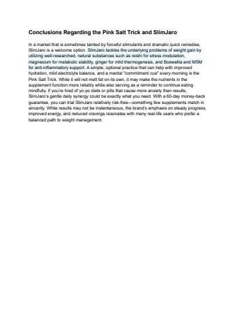 ConclusionsRegardingthePinkSaltTrickandSlimJaroInamarketthatissometimestaintedbyforcefulstimulantsanddramaticquickremedies,SlimJaroisawelcomeoption.SlimJarotacklestheunderlyingproblemsofweightgainbyutilizingwell-researched,naturalsubstancessuchasreishiforstressmodulation,magnesiumformetabolicstability,gingerformildthermogenesis,andBoswelliaandMSMforanti-inflammatorysupport.Asimple,optionapracticethatcanhelpwthimprovedhydration,mildelectrolytebalance,andamental\PinkSaltTrick.Whileitwillnotmeltfatonitsown,itmaymakethenutrientsinthesupplementfunctionmorereiablywhilealsoservingasaremindertocontinueeatingmindfully.Ifyou%u2019retiredofyo-yodietsorpillsthatcausemoreanxietythanresults,SlimJaro%u2019sgentledailysynergycouldbeexactlywhatyouneed.Witha60-daymoney-backguarantee,youcantrialSlimJarorelativelyrisk-free%u2014somethingfewsupplementsmatchinsincerity.Whileresultsmaynotbeinstantaneous,thebrand%u2019semphasisonsteadyprogress,improvedenergy,andreducedcravingsresonateswithmanyreal-lifeuserswhopreferabalancedpathtoweightmanagement
