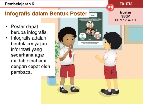 Pembelajaran 6: T8 ST3 P6 Infografis dalam Bentuk Poster Muatan SBdP KD 3.1 dan 4.1 • Poster dapat berupa infografis. • Infografis adalah bentuk penyajian informasi yang sederhana agar mudah dipahami dengan cepat oleh pembaca.
