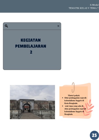 E-Modul TEMATIK KELAS V TEMA 7 KEGIATAN PEMBELAJARAN 2 Materi pokok Situs peninggalan sejarah kolonialisme Inggris di Kota Bengkulu seni rupa yang ada di situs peninggalan sejarah kolonialisme Inggris di Bengkulu 25