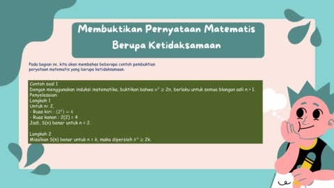 Misalkan S(n) benar untuk n = k, maka diperoleh ≥ 2k.