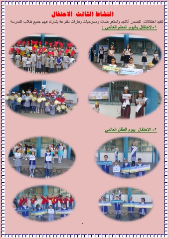تنفيذ احتفالات تتضمن أناشيد واستعراضات ومسرحيات وفقرات متنوعة يشارك فيهم جميع طلاب المدرسة