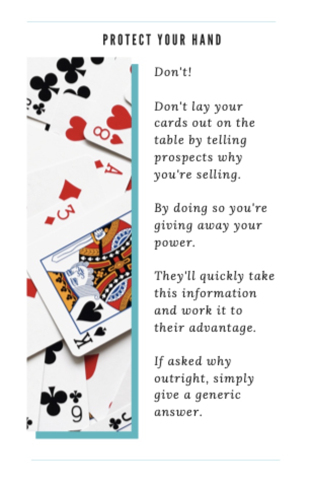 Don't lay your cards out on the table by telling prospects why you're selling.