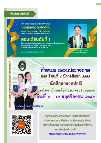 5 “ข่ำวประชำสัมพันธ์” ขอเชิญบุคลำกรและนักศึกษำ มหำวิทยำลัยรำชภัฏ ก ำแพงเพชร ลงทะเบียนในระบบ Line notify เพื่อรับ บริกำรข่ำวสำรของมหำวิทยำลัยฯ โดยไม่เสียค่ำใช้จ่ำย ลงทะเบียนรับยริกำรได้ที่ https://register.kpru.ac.th/KPRUNotify/