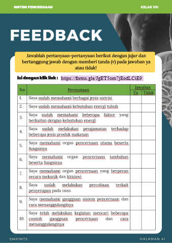 SISTEM PENCERNAAN KELAS VIII FEEDBACK Jawablah pertanyaan-pertanyaan berikut dengan jujur dan bertanggung jawab dengan memberi tanda (v) pada jawaban ya atau tidak! Isi dengan klik link : H A L A M A N 4 1 S M P / M T S
