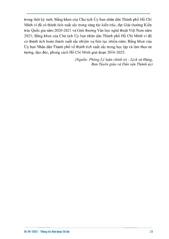 trong thời kỳ mới; Bằng khen của Chủ tịch Ủy ban nhân dân Thành phố Hồ Chí