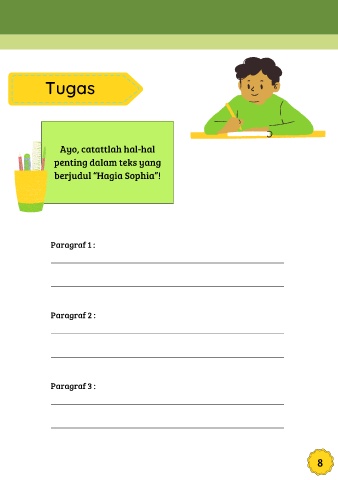 Tugas Ayo, catattlah hal-hal penting dalam teks yang berjudul “Hagia Sophia”! Paragraf 1 : Paragraf 2 : Paragraf 3 : 8