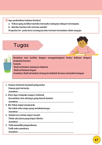 Jawaban: Rudi terlambat datang ke Sekolah karena terlambat bangun.