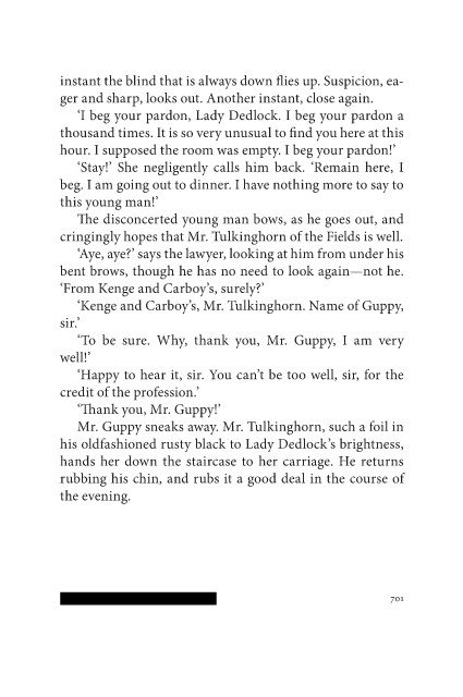 Mr. Guppy sneaks away. Mr. Tulkinghorn, such a foil in