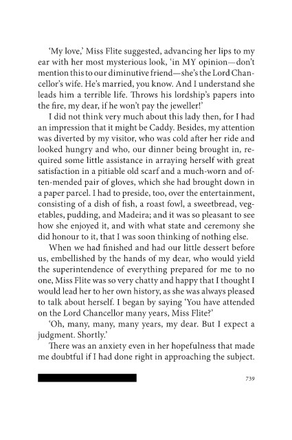 ‘My love,’ Miss Flite suggested, advancing her lips to my