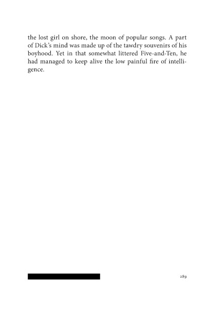 the lost girl on shore, the moon of popular songs. A part of Dick’s mind was made up of the tawdry souvenirs of his boyhood. Yet in that somewhat littered Five-and-Ten, he had managed to keep alive the low painful fire of intelli- gence. 289