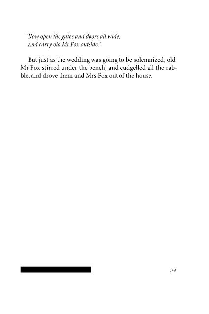 ‘Now open the gates and doors all wide, And carry old Mr Fox outside.’ But just as the wedding was going to be solemnized, old Mr Fox stirred under the bench, and cudgelled all the rab- ble, and drove them and Mrs Fox out of the house. 1