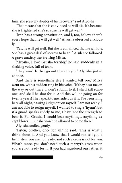 ‘Alyosha, I love Grusha terribly,’ he said suddenly in a