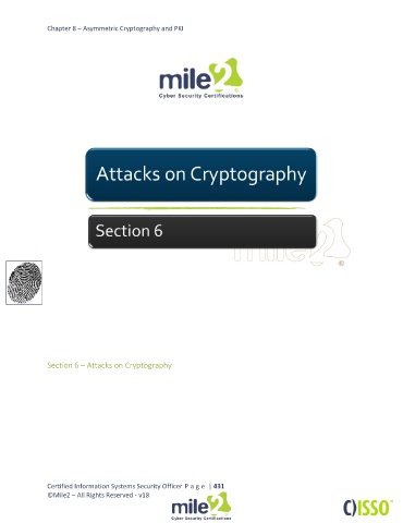 Chapter 8 – Asymmetric Cryptography and PKI Section 6 – Attacks on Cryptography Certified Information Systems Security Officer P a g e | 431 ©Mile2 – All Rights Reserved - v18