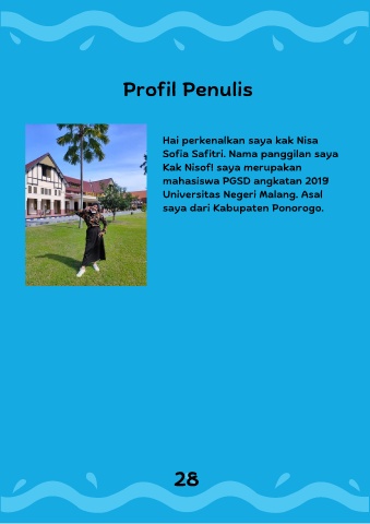 Profil Penulis Hai perkenalkan saya kak Nisa Sofia Safitri. Nama panggilan saya Kak Nisof! saya merupakan mahasiswa PGSD angkatan 2019 Universitas Negeri Malang. Asal saya dari Kabupaten Ponorogo. 28