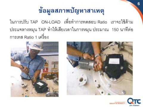 6 ขอมูลสภาพปญหาสาเหตุ ้ ั ้ ้ ในการปรบ TAP ON-LOAD เพื่อทาการทดสอบ Ratio เราจะใชดาม ั ี ประแจหางหมุน TAP ทาใหเสียเวลาในการหมุน ประมาณ 150 นาทต่อ ้ การเทส Ratio 1 เครอง ื่