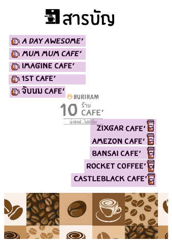 สารบัญ A Day Awesome’ Mum Mum cafe’ Imagine cafe’ 1st cafe’ จับนม cafe’ ZIXGAR cafe’ Amezon cafe’ Bansai cafe’ Rocket Coffee’ Castleblack cafe’