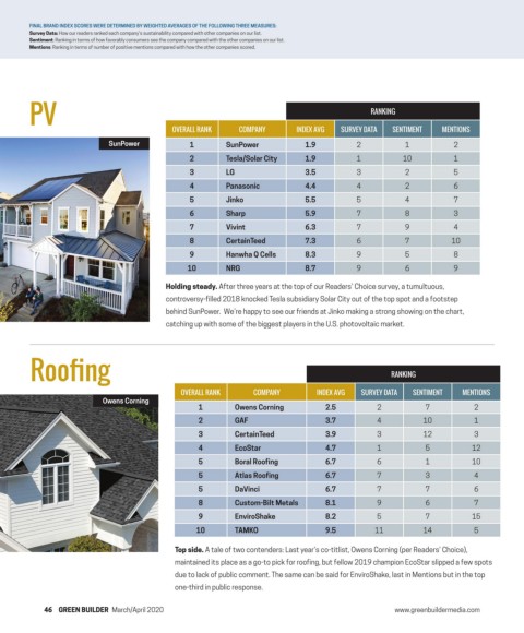 maintained its place as a go-to pick for roofing, but fellow 2019 champion EcoStar slipped a few spots