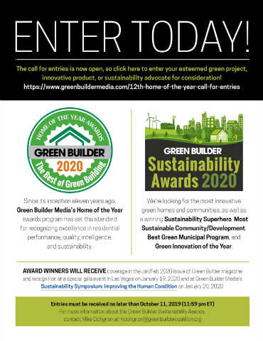 AWARD WINNERS WILL RECEIVE coverage in the Jan/Feb 2020 issue of Green Builder magazine