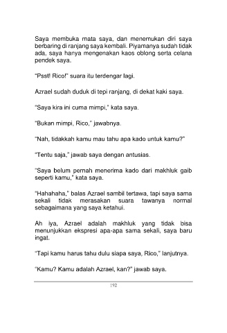 Azrael sudah duduk di tepi ranjang, di dekat kaki saya.