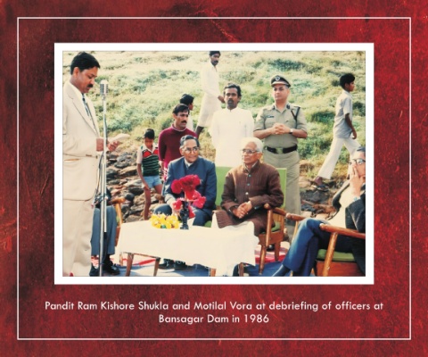 Pandit Ram Kishore Shukla and Motilal Vora at debriefing of officers at Bansagar Dam in 1986