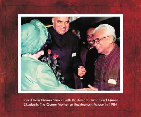Pandit Ram Kishore Shukla with Dr. Balram Jakhar and Queen Elizabeth, The Queen Mother at Buckingham Palace in 1984