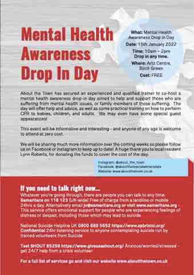 About the Town has secured an experienced and qualified trainer to co-host a mental health awareness drop-in day aimed to help and support those who are suffering from mental health issues, or family members of those suffering. The day will offer help and advice, as well as some practical training on how to perform CPR to babies, children, and adults. We may even have some special guest appearances!
