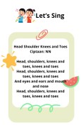 Let’s Sing Head Shoulder Knees and Toes Ciptaan: NN Head, shoulders, knees and toes, knees and toes Head, shoulders, knees and toes, knees and toes And eyes and ears and mouth and nose Head, shoulders, knees and toes, knees and toes