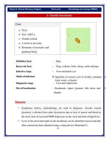 • Cysts in the stool and trophs in the duodenum can be identified microscopically