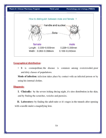 I. Clinically: by the severe itching during night, it's sites distribution in the skin,