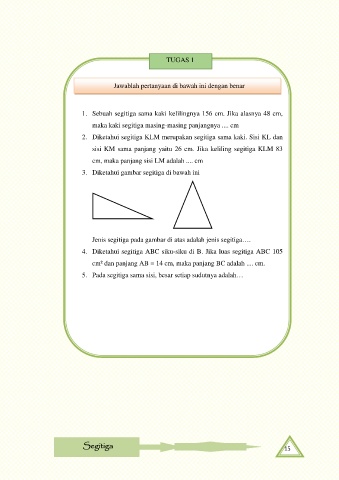 1. Sebuah segitiga sama kaki kelilingnya 156 cm. Jika alasnya 48 cm,