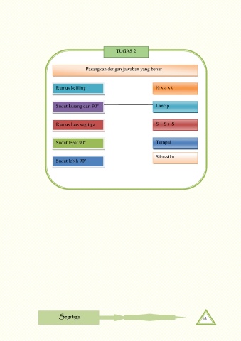 TUGAS 2 Pasangkan dengan jawaban yang benar Rumus keliling ½ x a x t segitiga Sudut kurang dari 90º Lancip Rumus luas segitiga S + S + S Sudut tepat 90º Tumpul Siku-siku Sudut lebih 90º Segitiga 16