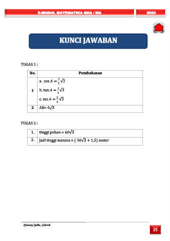 E-MODUL MATEMATIKA SMA / MA 2023 Kunci Jawaban KUNCI JAWABAN TUGAS 1 : No. Pembahasan a. √ 1 b. √ c. √ 2 = √ TUGAS 2 : 1. tinggi pohon = √ 2. Jadi tinggi menara = ( √ meter Alhady Daffa Zuhrah