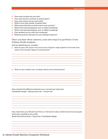 1 | Your Comprehensive Growth Strategy 11%u2022 How many locations do you have?%u2022 How many doctors are there at each location?%u2022 How many owners do you work with?%u2022 What is your total number of patient files?%u2022 What type of dentistry is performed in your practice?%u2022 What is the total spending per year on online marketing?%u2022 What is the total spending per year on offline marketing?%u2022 How satisfied are you with your marketing?%u2022 What key practice elements are you looking to improve?Once you have these answers, your next step is to perform a CostVolume-Profit Analysis.Start by identifying your variables: 1. What are your sales prices? How much do you charge for single implants? Full-mouth restorations? Gum therapy? Hygiene? Everything else?______________________________________________________________________________________________________________________________________________________________________________________________________________________________________________________________________________________________________________________________________________________________________________________________________________________________________________________________________________________________________________________________________________________________________________________________________________________________2. What are your variable costs, including material, time and production?______________________________________________________________________________________________________________________________________________________________________________________________________________________________________________________________________________________________________________________________________________________________________________________________________________________________________________________________________________________________________________________________________________________________________________________________________________________________Now calculate the difference between your cost and your sales price.Contribution margin%u00a0=%u00a0Sales price per unit %u2013 Cost per unit______________________________________________________________________________________________________________________________________________________________________________________________________________________________________________________________________________________________________________________________________________________________________________________________________________________________________________________________________________________________________________________________________________________________________________________________________________________________Now, determine your Break-Even Point, or the level of sales at which total revenue equals total costs, resulting in zero profit.Break-Even Point (in units)%u00a0=%u00a0Fixed Costs / Contribution Margin______________________________________________________________________________________________________________________________________________________________________________________________________________________________________________________________________________________________________________________________________________________________________________________________________________________________________________________________________________________________________________________________________________________________________________________________________________________________12 Dental Growth Machine: Transform Your Practice by Attracting High-Value Patients Who Pay, Stay, and Refer WorkbookNow that you have these metrics, you can analyze your profit at different levels of activity.You do this with the following formula:Profit%u00a0=%u00a0(Sales Volume * Sales Price per Unit) - (Sales Volume * Variable Cost per Unit) - Fixed CostsThis Cost-Volume-Profit (CVP) Analysis will help you formulate pricing strategies, determine how much you%u2019re willing to spend on marketing, and understand the risks and rewards associated with different offers and promotions.Now, it%u2019s time to perform a technology inventory.WHAT ROLE DOES TECHNOLOGY PLAY IN YOUR PRACTICE?%u2022 Do you have a website? Are you happy with it?%u2022 Do you communicate with your current patients through text and email?%u2022 Do you have long-term nurture strategies to keep in touch with current patients?%u2022 Do you have outreach initiatives through social media?%u2022 What processes do you currently have for handling online and offline data?%u2022 What is your central marketing database system? Do you use HubSpot, GoHighLevel, ClickFunnels, Keap, Thryv, or other applications? We have developed our own proprietary system on the GoHighLevel platform, called eBGS: eLaunchers Best GROWTH System.%u2022 What%u2019s the state of your data? Is it old, stale or inaccurate?YOUR COMPETITIVE ANALYSIS: WHO ARE YOUR BIGGEST POTENTIAL ALLIES AND COMPETITORS?%u2022 Who is your direct competition?%u2022 Who is your indirect competition?%u2022 Who can challenge or compete most effectively with you?%u2022 Who can you most effectively compete with?%u2022 Who has the %u201cbest clients%u201d for your business currently?%u2022 Who can you partner with to access their customers?%u2022 What relationships can you establish or grow to build your business?%u2022 Whose client list is compatible with your goals?%u2022 Who has the customers you want and how can you collaborate with them?%u2022 What businesses can you co-market with?If you%u2019ve spent time with this workbook, you now have a clear snapshot of where you are as a practice owner and where you wish to be. You have identified your greatest challenges and opportunities and outlined specific, actionable steps you can take to help you achieve your goals. The work you did in this section was time well spent and will he