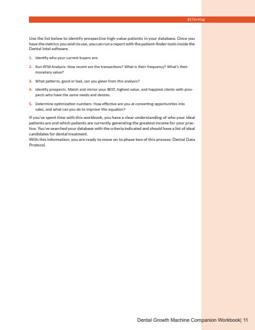 18 Dental Growth Machine: Transform Your Practice by Attracting High-Value Patients Who Pay, Stay, and Refer WorkbookThe Magic of PRISM Research WorkbookPRISM research is all about taking a deep dive into your database and coming out with valu,able insight into how to reach out and connect with your ideal patients.You%u2019ll want to spend some time with this workbook because what you discover could easily increase your revenue by 20% to 50% or more.Let%u2019s start with a series of questions:Who are your ideal prospects? Are they male or female? Young or old? Do they own their own homes? Do they have American Express Cards?The key to PRISM research is identifying the 20% of patients responsible for 80% of your sales revenue.Take a few moments to describe the types of patients you most want to attract to your practice:______________________________________________________________________________________________________________________________________________________________________________________________________________________________________________________________________________________________________________________________________________________________________________________________________________________________________________________________________________________________________________________________________________________________________________________________________________________________By identifying your ideal prospects and the patients responsible for the lion%u2019s share of your sales revenue, you can design and implement custom marketing campaigns that generate a robust stream of excellent prospects eager to do business with you.An essential part of PRISM is understanding how much your patients are worth to you%u2014and yes, I%u2019m speaking of a dollar amount. More specifically, what is their lifetime value?You find this with a bit of quick, simple math.Take the average amount an average patient spends each year, including routine cleanings. Multiply that by the average number of years they stay with you and add the number of re,ferrals they send. When you calculate this, you get the lifetime value of an average patient.______________________________________________________________________________________________________________________________________________________________________________________________________________________________________________________________________________________________________________________________________________________________________________________________________________________________________________________________________________________________________________________________________________________________________________________________________________________________This number is specific to your practice and based on calculations only you can make. Know,ing it provides valuable insight into the type of dentistry you%u2019ll want to practice from this point forward.Most dentists recommend routine and basic cleanings once a year. These cleanings typically cost about $165 and usually take the dentist or hygienist 30 minutes to an hour to complete.For a practice specializing in dental implants, a patient%u2019s average value starts at about $6,000.These numbers tell us a general dentist will need SIX THOUSAND ordinary dental patients to equal the net revenue of 165 to 170 implant patients. Once you%u2019ve decided who your ideal patients are and what type of patients you wish to attract, you can design a custom-made marketing campaign to attract more of them to your practice.A crucial element of having an effective marketing campaign is having the right list.PRISM is all about data-driven marketing and finding diamonds in your database.2 | The Magic of PRISM Research 19Use the list below to identify prospective high-value patients in your database. Once you have the metrics you wish to use, you can run a report with the patient-finder tools inside the Dental Intel software. 1. Identify who your current buyers are.2. Run RFM Analysis: How recent are the transactions? What is their frequency? What%u2019s their monetary value?3. What patterns, good or bad, can you glean from this analysis?4. Identify prospects. Match and mirror your BEST, highest value, and happiest clients with prospects who have the same needs and desires.5. Determine optimization numbers: How effective are you at converting opportunities into sales, and what can you do to improve this equation?If you%u2019ve spent time with this workbook, you have a clear understanding of who your ideal patients are and which patients are currently generating the greatest income for your practice. You%u2019ve searched your database with the criteria indicated and should have a list of ideal candidates for dental treatment.With this information, you are ready to move on to phase two of this process: Dental Data Protocol.Dental Growth Machine Companion Workbook| 11
