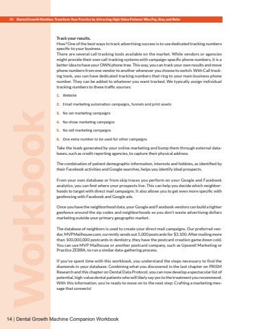 30 Dental Growth Machine: Transform Your Practice by Attracting High-Value Patients Who Pay, Stay, and Refer WorkbookTrack your results.How? One of the best ways to track advertising success is to use dedicated tracking numbers specific to your business.There are several call tracking tools available on the market. While vendors or agencies might provide their own call tracking systems with campaign-specific phone numbers, it is a better idea to have your OWN phone tree. This way, you can track your own results and move phone numbers from one vendor to another whenever you choose to switch. With Call tracking tools, you can have dedicated tracking numbers that ring to your main business phone number. They can be added to whatever you want tracked. We typically assign individual tracking numbers to these traffic sources:1. Website2. Email marketing automation campaigns, funnels and print assets3. No set marketing campaigns4. No-show marketing campaigns5. No sell marketing campaigns6. One extra number to be used for other campaignsTake the leads generated by your online marketing and bump them through external databases, such as credit reporting agencies, to capture their physical address.The combination of patient demographic information, interests and hobbies, as identified by their Facebook activities and Google searches, helps you identify ideal prospects.From your own database or from skip traces you perform on your Google and Facebook analytics, you can find where your prospects live. This can help you decide which neighborhoods to target with direct mail campaigns. It also allows you to get even more specific with geofencing with Facebook and Google ads.Once you have the neighborhood data, your Google and Facebook vendors can build a tighter geofence around the zip codes and neighborhoods so you don%u2019t waste advertising dollars marketing outside your primary geographic market.The%u00a0database of neighbors%u00a0is used to create your direct mail campaigns. Our preferred vendor, MVPMailhouse.com, currently sends out 5,000 postcards for $3,100. After mailing more than 100,000,000 postcards in dentistry, they have the postcard creation game down cold. You can use MVP Mailhouse or another postcard company, such as Upswell Marketing or Practice ZEBRA, to run a similar data-gathering process.If you%u2019ve spent time with this workbook, you understand the steps necessary to find the diamonds in your database. Combining what you discovered in the last chapter on PRISM Research and this chapter on Dental Data Protocol, you can now develop a spectacular list of potential, high-value dental patients who will likely say yes to the treatment you recommend.With this information, you%u2019re ready to move on to the next step: Crafting a marketing message that connects!14 | Dental Growth Machine Companion Workbook