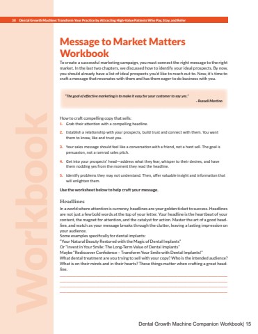 30 Dental Growth Machine: Transform Your Practice by Attracting High-Value Patients Who Pay, Stay, and Refer WorkbookTrack your results.How? One of the best ways to track advertising success is to use dedicated tracking numbers specific to your business.There are several call tracking tools available on the market. While vendors or agencies might provide their own call tracking systems with campaign-specific phone numbers, it is a better idea to have your OWN phone tree. This way, you can track your own results and move phone numbers from one vendor to another whenever you choose to switch. With Call track,ing tools, you can have dedicated tracking numbers that ring to your main business phone number. They can be added to whatever you want tracked. We typically assign individual tracking numbers to these traffic sources:1. Website2. Email marketing automation campaigns, funnels and print assets3. No set marketing campaigns4. No-show marketing campaigns5. No sell marketing campaigns6. One extra number to be used for other campaignsTake the leads generated by your online marketing and bump them through external data,bases, such as credit reporting agencies, to capture their physical address.The combination of patient demographic information, interests and hobbies, as identified by their Facebook activities and Google searches, helps you identify ideal prospects.From your own database or from skip traces you perform on your Google and Facebook analytics, you can find where your prospects live. This can help you decide which neighbor,hoods to target with direct mail campaigns. It also allows you to get even more specific with geofencing with Facebook and Google ads.Once you have the neighborhood data, your Google and Facebook vendors can build a tighter geofence around the zip codes and neighborhoods so you don%u2019t waste advertising dollars marketing outside your primary geographic market.The%u00a0database of neighbors%u00a0is used to create your direct mail campaigns. Our preferred ven,dor, MVPMailhouse.com, currently sends out 5,000 postcards for $3,100. After mailing more than 100,000,000 postcards in dentistry, they have the postcard creation game down cold. You can use MVP Mailhouse or another postcard company, such as Upswell Marketing or Practice ZEBRA, to run a similar data-gathering process.If you%u2019ve spent time with this workbook, you understand the steps necessary to find the diamonds in your database. Combining what you discovered in the last chapter on PRISM Research and this chapter on Dental Data Protocol, you can now develop a spectacular list of potential, high-value dental patients who will likely say yes to the treatment you recommend.With this information, you%u2019re ready to move on to the next step: Crafting a marketing mes,sage that connects!38 Dental Growth Machine: Transform Your Practice by Attracting High-Value Patients Who Pay, Stay, and Refer WorkbookMessage to Market Matters WorkbookTo create a successful marketing campaign, you must connect the right message to the right market. In the last two chapters, we discussed how to identify your ideal prospects. By now, you should already have a list of ideal prospects you%u2019d like to reach out to. Now, it%u2019s time to craft a message that resonates with them and has them eager to do business with you.%u201cThe goal of effective marketing is to make it easy for your customer to say yes.%u201d- Russell MartinoHow to craft compelling copy that sells:1. Grab their attention with a compelling headline.2. Establish a relationship with your prospects, build trust and connect with them. You want them to know, like and trust you.3. Your sales message should feel like a conversation with a friend, not a hard sell. The goal is persuasion, not a ramrod sales pitch.4. Get into your prospects%u2019 head%u2014address what they fear, whisper to their desires, and have them nodding yes from the moment they read the headline.5. Identify problems they may not understand. Then, offer valuable insight and information that will enlighten them.Use the worksheet below to help craft your message.HeadlinesIn a world where attention is currency, headlines are your golden ticket to success. Headlines are not just a few bold words at the top of your letter. Your headline is the heartbeat of your content, the magnet for attention, and the catalyst for action. Master the art of a good headline, and watch as your message breaks through the clutter, leaving a lasting impression on your audience.Some examples specifically for dental implants:%u201cYour Natural Beauty Restored with the Magic of Dental Implants%u201dOr %u201cInvest in Your Smile: The Long-Term Value of Dental Implants%u201dMaybe %u201cRediscover Confidence %u2013 Transform Your Smile with Dental Implants!%u201dWhat dental treatment are you trying to sell with your copy? Who is the intended audience? What is on their minds and in their hearts? These things matter when crafting a great headline.____________________________________________________________________________________________________________________________________________________________________________________________________________________________________________________________________________________________________________________________________________________________________________________________________________________Dental Growth Machine Companion Workbook| 15